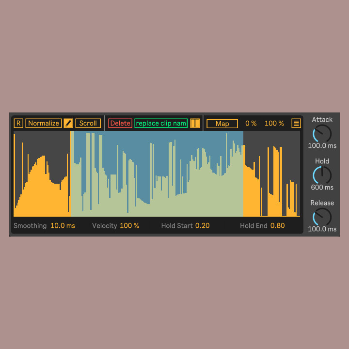 A Max for Live MIDI device that maps to and modulates parameters with a mouse-drawn envelope. easr.drawnvelope saves with the Live set, and can store presets for clip names, including the option to save different mappings with each preset, or to have mappings persistent across clip launches.